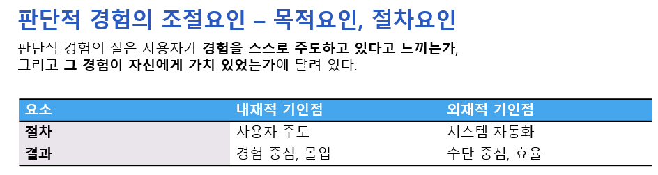 판단적 경험은 사용자가 경험을 어떻게 해석하고 받아들이는가에 따라 그 질이 달라진다. 특히 중요한 것은 사용자가 “이 경험을 내가 스스로 주도하고 있다”고 느끼는가, 그리고 “그 경험이 나에게 가치 있는가”라는 두 가지 기준이다. 이러한 기준은 경험을 규정하는 두 가지 핵심 요인인 절차요인과 목적요인(결과요인)을 통해 구체화된다.