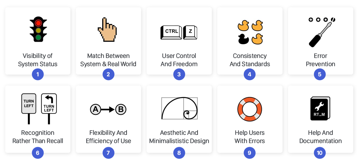 이러한 휴리스틱 원칙들은 전문가가 어플리케이션 또는 웹사이트를 신속하게 평가하고 문제점을 식별할 수 있게 돕습니다. 단, 이것은 초기 단계의 빠른 검사용이며, 실제 사용자 테스트를 완전히 대체할 수 있는 것은 아닙니다.