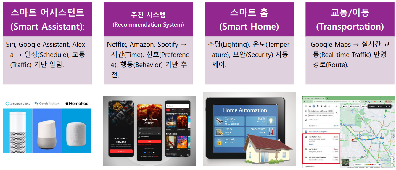 우리는 지금도 일상 속에서 다양한 상황인식(Context Awareness) 기술을 자연스럽게 경험하고 있다. 스마트 어시스턴트(Siri, Google Assistant, Alexa)는 사용자의 일정이나 교통 상황을 반영해 적절한 시점에 알림을 제공하고, 넷플릭스·아마존·스포티파이와 같은 추천 시스템은 시간, 개인의 선호, 행동 패턴을 분석하여 맞춤형 콘텐츠를 제안한다. 또한 스마트홈에서는 조명·온도·보안이 자동으로 제어되어 쾌적한 생활 환경을 조성하고, Google Maps와 같은 교통 서비스는 실시간 교통 데이터를 반영하여 최적의 경로를 안내한다. 이처럼 우리는 지금도 다양한 디지털 서비스 속에서 상황인식 기술을 통해 맥락에 맞춘 편리하고 직관적인 경험을 누리고 있다.