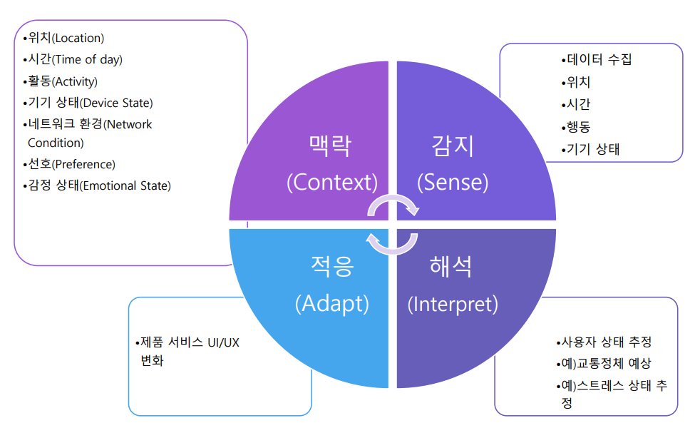 - 해석(Interpret): 전처리(노이즈 제거·정규화) 후 맥락 모델링으로 고수준 의미를 추론한다(예: 좌표→“도서관”, 가속도 패턴→“걷는 중”, 마이크·표정→“소음 높은 환경/긴장”). 규칙 기반(If-Then), 통계·기계학습, 온톨로지/지식그래프, 시계열 모델 등을 사용한다.