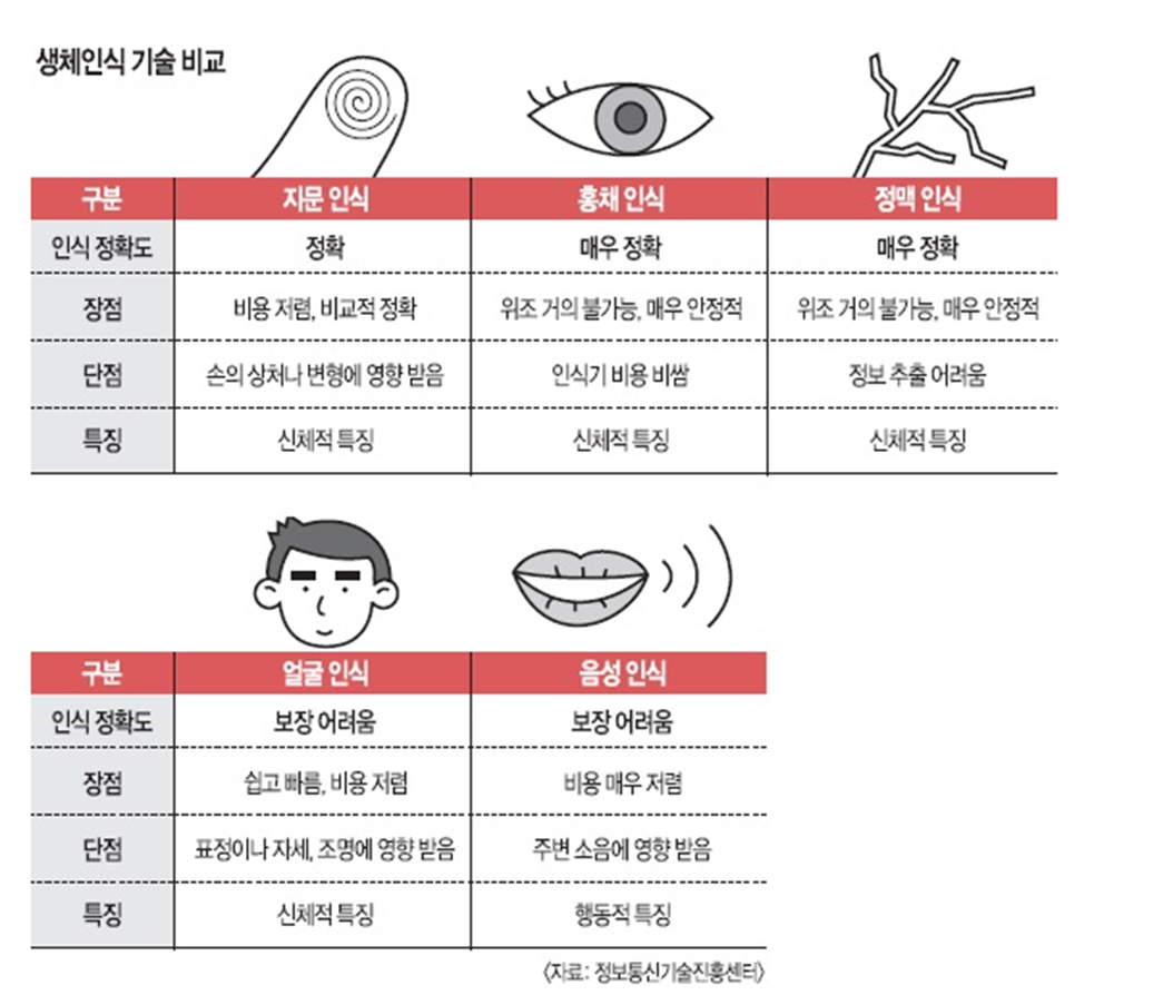 기존의 인증 방식이 암호(password)나 개인식별번호(PIN: Personal Identification Number)처럼 기억이나 소지물에 의존하는 방식이었다면, 생체인식은 인간 자신을 인증 수단으로 활용하는 ‘신체 기반 보안’이라는 점에서 본질적인 차이를 가진다. 암호는 도난·분실·위조의 위험이 있지만, 생체 정보는 개인 고유의 특징으로서 대체 불가능하며, 사용자가 반드시 존재해야만 인증이 가능하다는 점에서 보안성과 편의성을 동시에 확보할 수 있다.