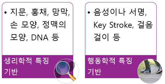 | 예시 | 지문, 홍채, 망막, 정맥, DNA 등 | 음성, 서명, 키 스트로크, 걸음걸이 등 |