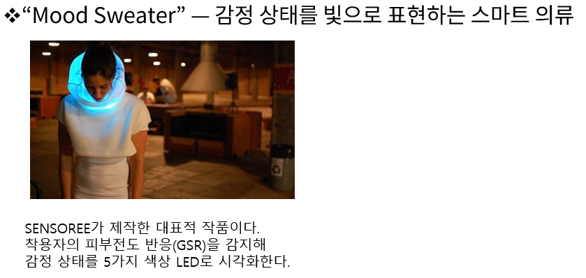 - 무드 스웨터(Mood Sweater): 착용자의 피부전도 반응을 색으로 표현해 감정을 시각화