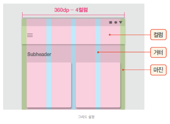 기본적으로360dp기준 모바일 화면에서는4컬럼(열)을, 태블릿에서는600dp 8컬럼을, 데스크 톱의 웹 화면에서는1280dp 12컬럼을 사용할 것을 권장한다.
