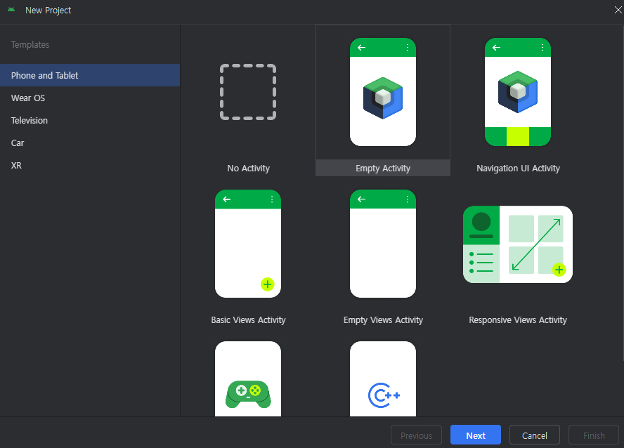 - Empty Views Activity: XML 기반 UI 학습에 적합하다. (Compose는 다음 회차에서 별도 다루는 편이 안정적이다)