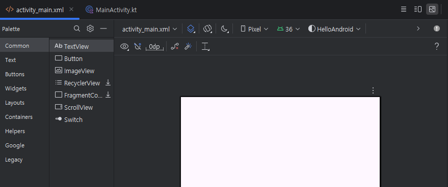 activity_main.xml에서 TextView에 “Hello Android”를 보이게 만드는 최소 예시이다.