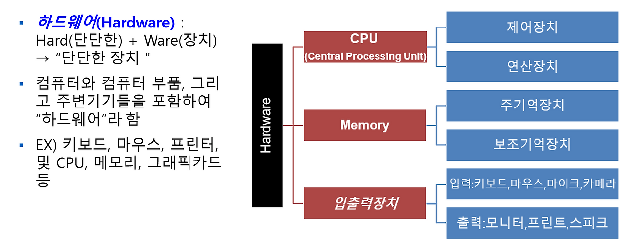 입력된 데이터는 사람이 단기 기억과 장기 기억으로 나누어 저장하는 것과 유사하게, 컴퓨터도 내부 저장 장치(메모리)와 외부 저장 장치(SSD, HDD 등)를 통해 데이터를 저장한다. 즉, CPU(중앙처리장치), 메모리(저장장치), 입출력 장치는 컴퓨터 하드웨어의 3대 요소로 불린다. 그리고, 이러한 하드웨어를 구동하는 명령 체계의 집합을 소프트웨어(Software)라고 하며, 소프트웨어는 크게 다음과 같이 분류된다.