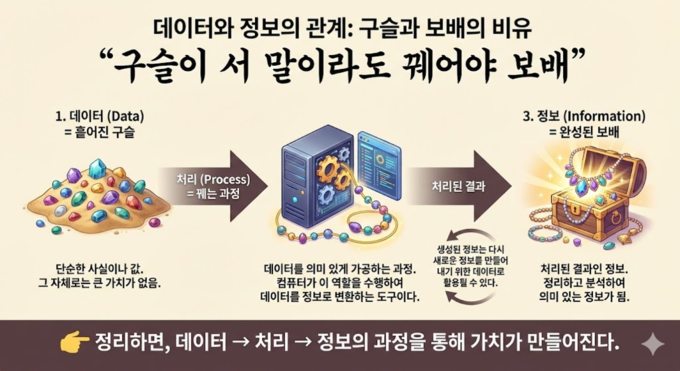 구슬이 서말이라도 꿰메야 보석인 것처럼 구슬 자체는 의미없는 값이 데이터가 되는 것이고 이것을 꿰메어 가치있게 만들어 보석이 된 것을 우리는 정보라고 하죠.