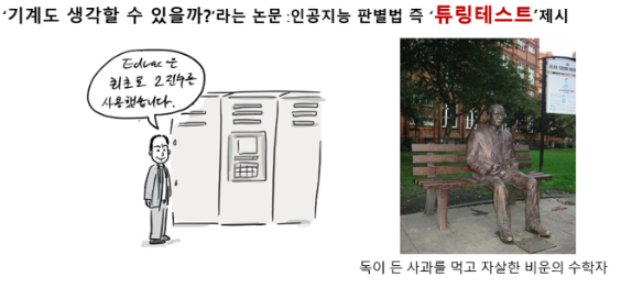- "기계도 생각할 수 있을까?"라는 논문에서, 기계가 인간처럼 사고할 수 있는지를 판단하는 방법으로 튜링 테스트(Turing Test)를 제안하였다.