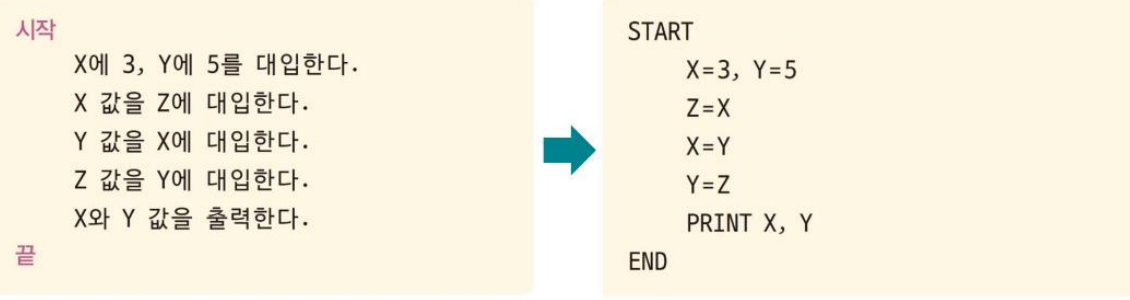 - 의사: 실제 프로그래밍 언어와 비슷하지만 실제 코드가 아닌, 논리적 흐름을 표현하는 방식이다.