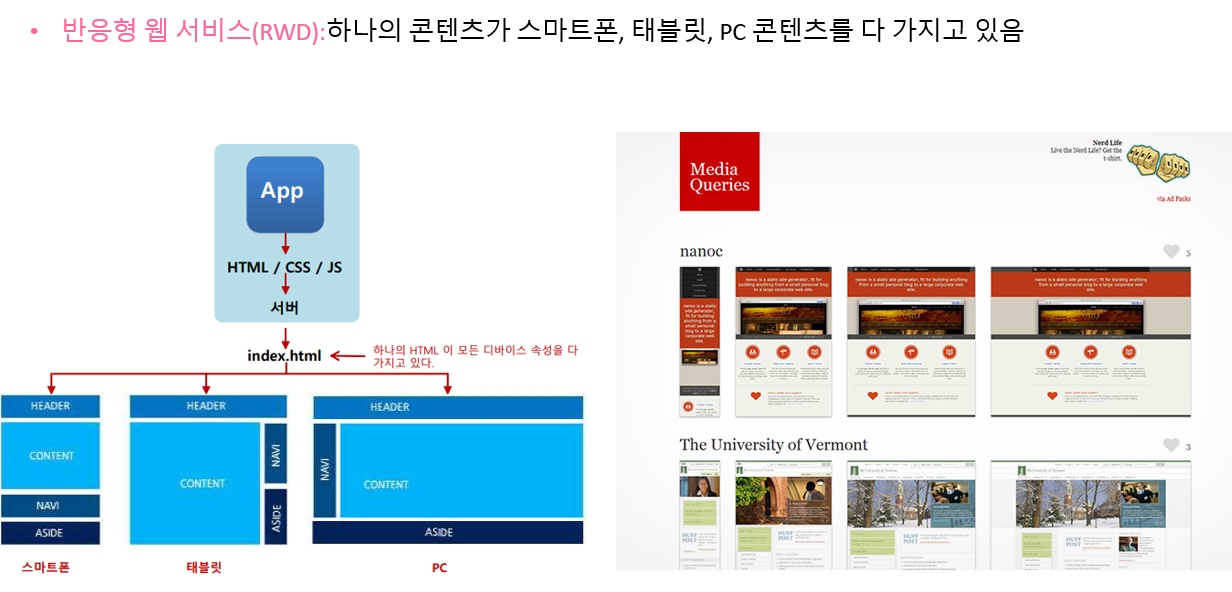 - 하나의 HTML 파일이 PC용 웹사이트, 태블릿용, 스마트폰용으로 자동리사이징이 되어지는 형태를 반응형 웹앱(Responsive Web App)