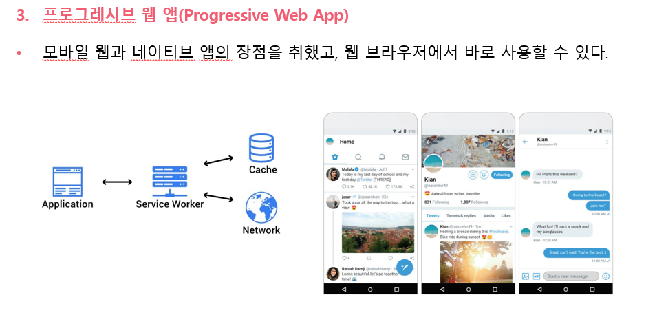 웹앱과 네이티브 앱의 장점을 결합한 형태의 애플리케이션이다. PWA는 웹 기술(HTML, CSS, JavaScript)을 사용하여 웹 브라우저에서 실행되지만, 네이티브 앱처럼 오프라인 기능, 푸시 알림, 홈 화면 아이콘 추가 등을 제공하여 앱과 유사한 사용자 경험을 제공한다.
