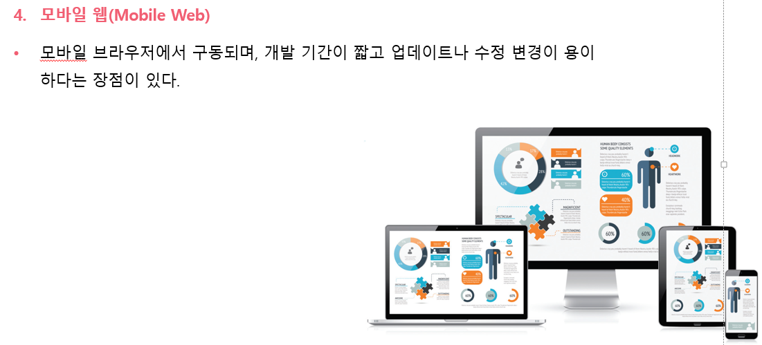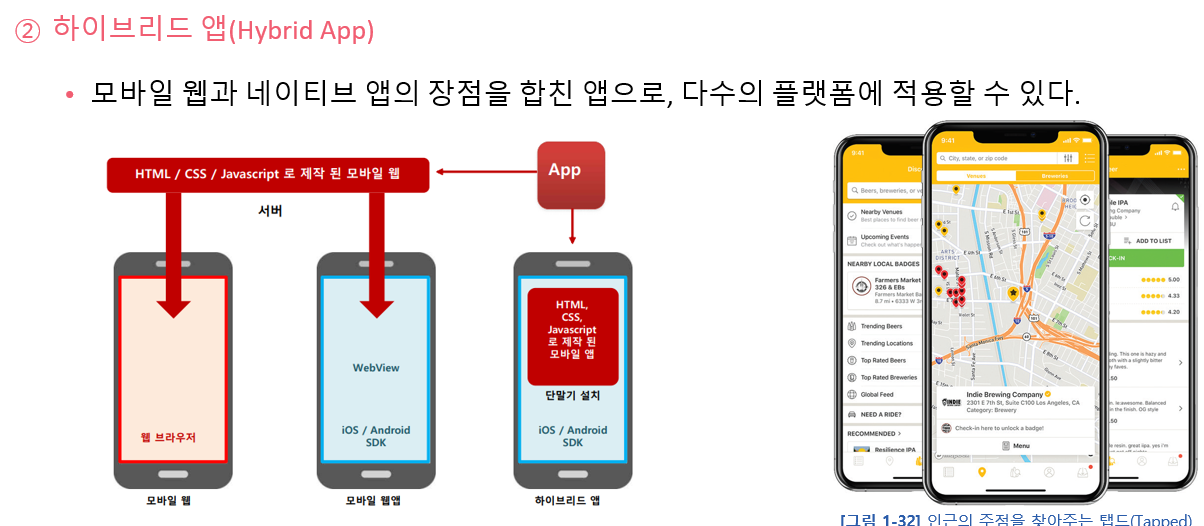 •모바일 앱의 종류는 대표적으로 네이티브 앱(Native App)과 하이브리드 앱(Hybrid App)으로 구분되지만, 최근에는 프로그레시브 웹 앱(Progressive web App)과 모바일 웹(Mobile web)도 앱의 종류에 포함된다.