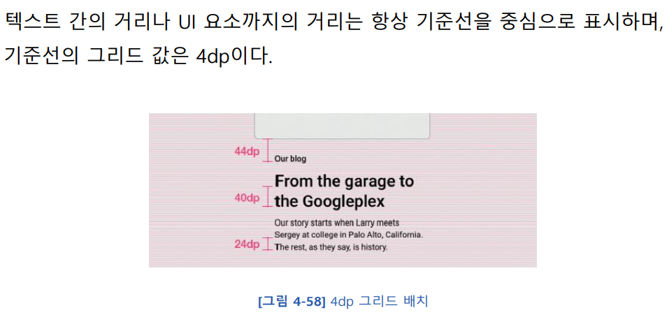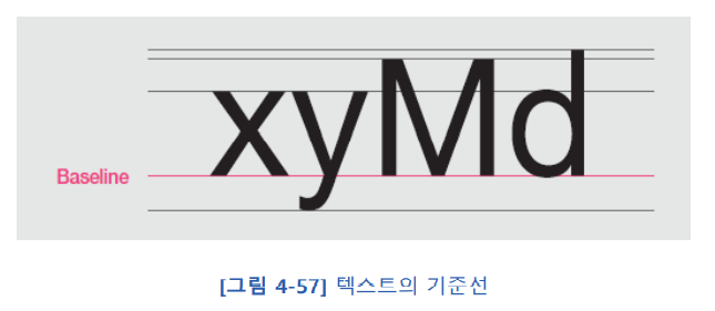가장 기본적으로 알고 있어야 하는 원리는 기준선이다. 기준선의 위치는 [그림 4-57]과 같다. 머티리얼 디자인에서 기준선은 텍스트와 요소 사이의 수직 거리를 측정할 때 중요한 사양이므로 꼭 기억해야 한다.