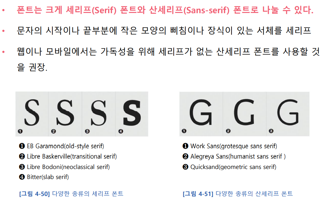 - 웹이나 모바일에서는 가독성을 위해 산세리프 폰트를 사용할 것을 권장한다.
