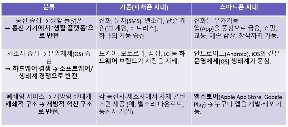 스마트폰의 등장은 모바일 환경의 패러다임을 완전히 바꾸어 놓았다. 과거의 피처폰은 단순히 통신을 위한 도구에 불과했으나, 오늘날의 스마트폰은 생활 전반을 아우르는 플랫폼으로 진화하였다. 이러한 변화는 크게 세 가지 측면에서 살펴볼 수 있다.