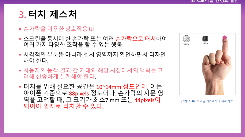 - 터치 제스처는 직관성과 맥락성을 기반으로 하며, 사용자가 불편함 없이 입력할 수 있도록 충분한 터치 영역 확보가 필수적이다.