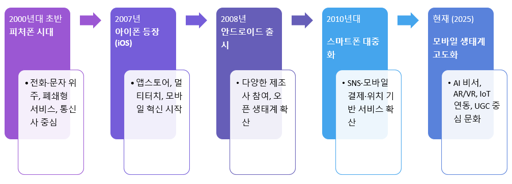 스마트폰은 일상 속 필수품으로 자리잡으며, SNS, 모바일 결제, 위치 기반 서비스 등이 본격적으로 확산되었다. 이용자들은 단순 소비자가 아니라 직접 콘텐츠를 생산하고 참여하는 주체로 변모하였다. - 현재 (2025년) – 모바일 생태계 고도화