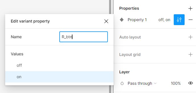 - 속성이름을 변경하고 각각의 베리언츠 value를 off/on으로 변경