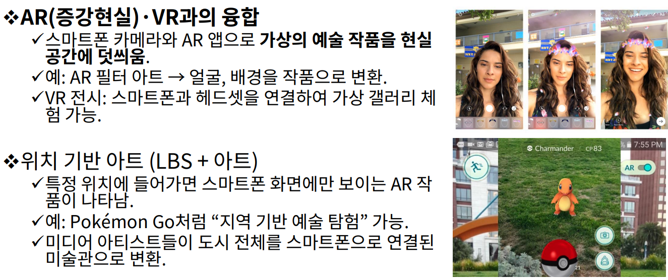 - AR 필터 아트, 위치 기반 예술은 도시 전체를 스마트폰 기반 미술관으로 확장시킴.