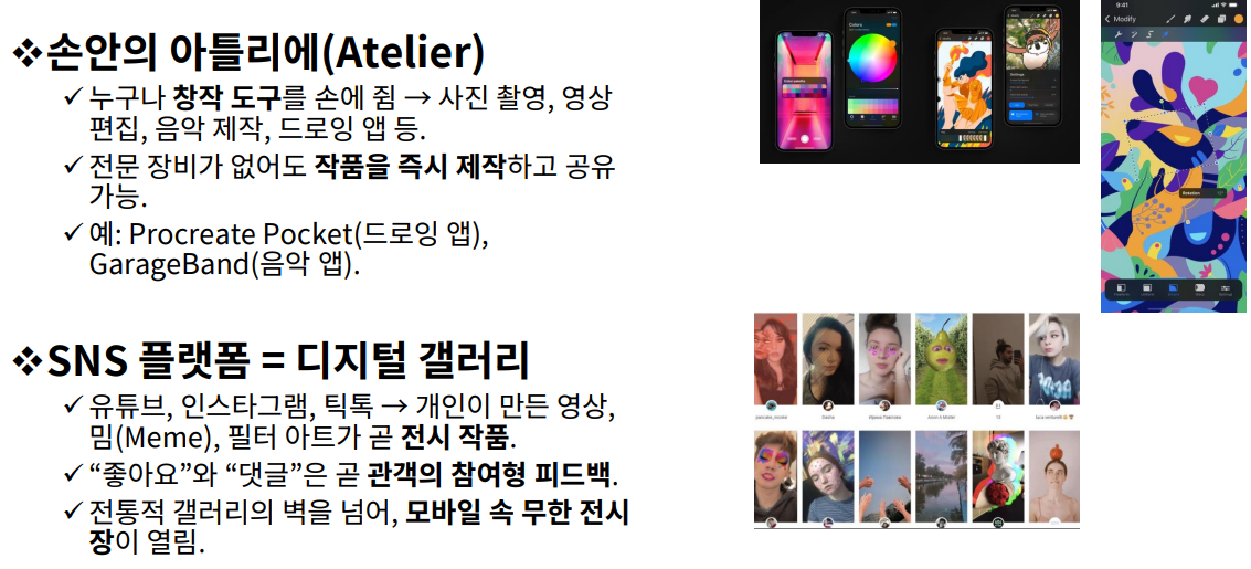 - 스마트폰은 ‘손안의 아틀리에’로, 누구나 사진·영상·음악을 제작할 수 있는 창작 도구가 됨.