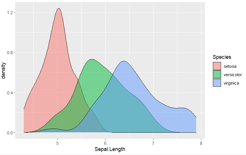 실습2 : iris 의 종류별 꽃받침 길이의 밀도 -geom_density()
