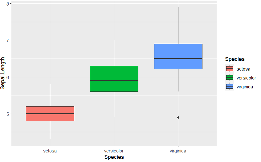 ggplot(iris, aes(Species, Sepal.Length, fill=Species)) +