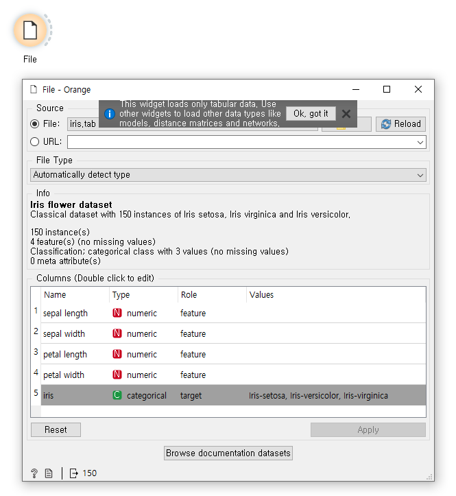 - 기능을 수행하는 아이콘들로 위젯을 불러와 연결하는 과정을 통해 데이터 처리, 시각화, 모델 적용 등 분석 평가를 할 수 있다.