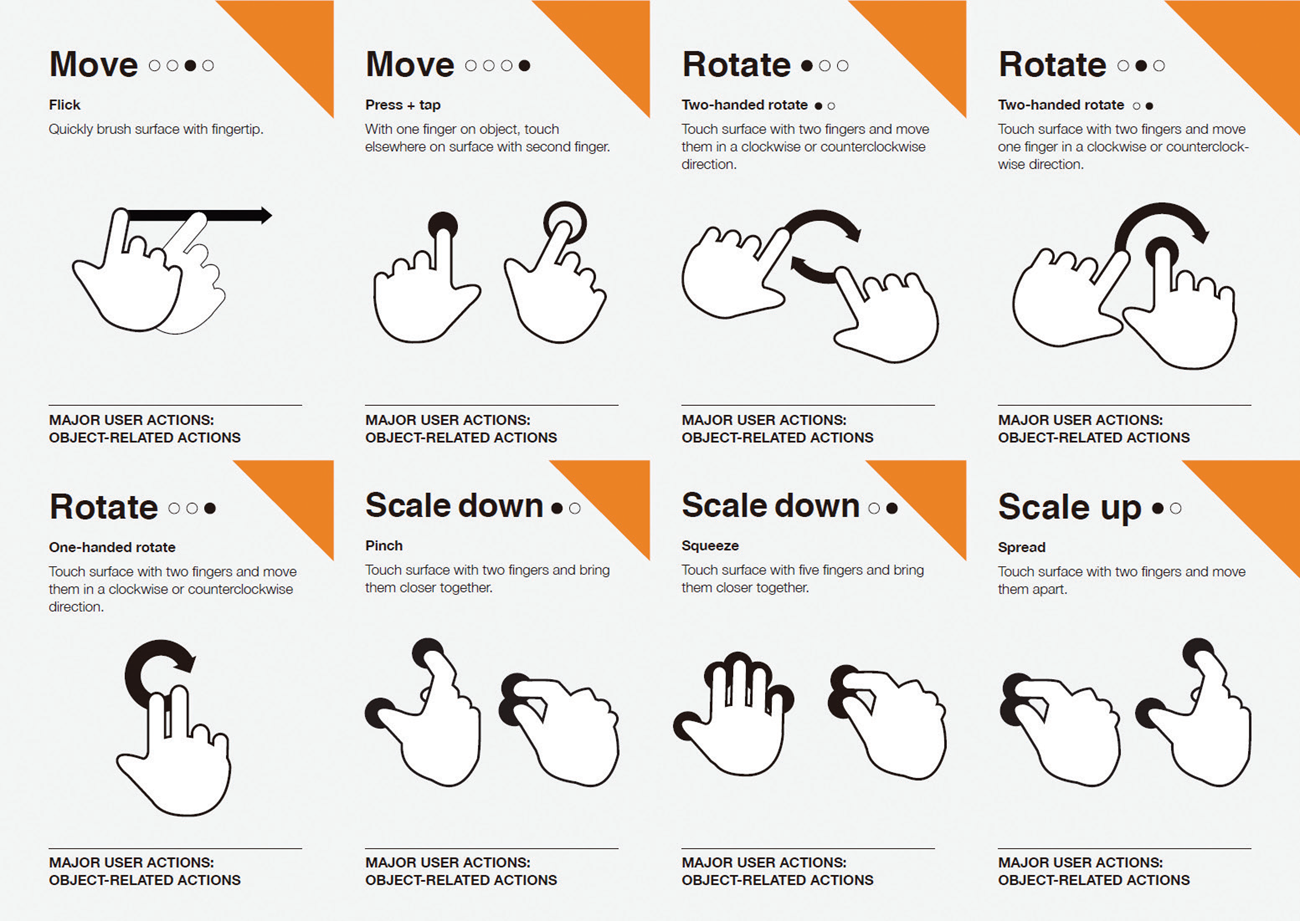 •프레스(Press) : 화면을 2초 이상 손가락으로 길게 누르는 동작. 터치 앤드 홀드. 메뉴나 팝업과 같은 화면의 컴포넌트를 나타나게 하거나 글씨를 확대 또는 복사하는 용도