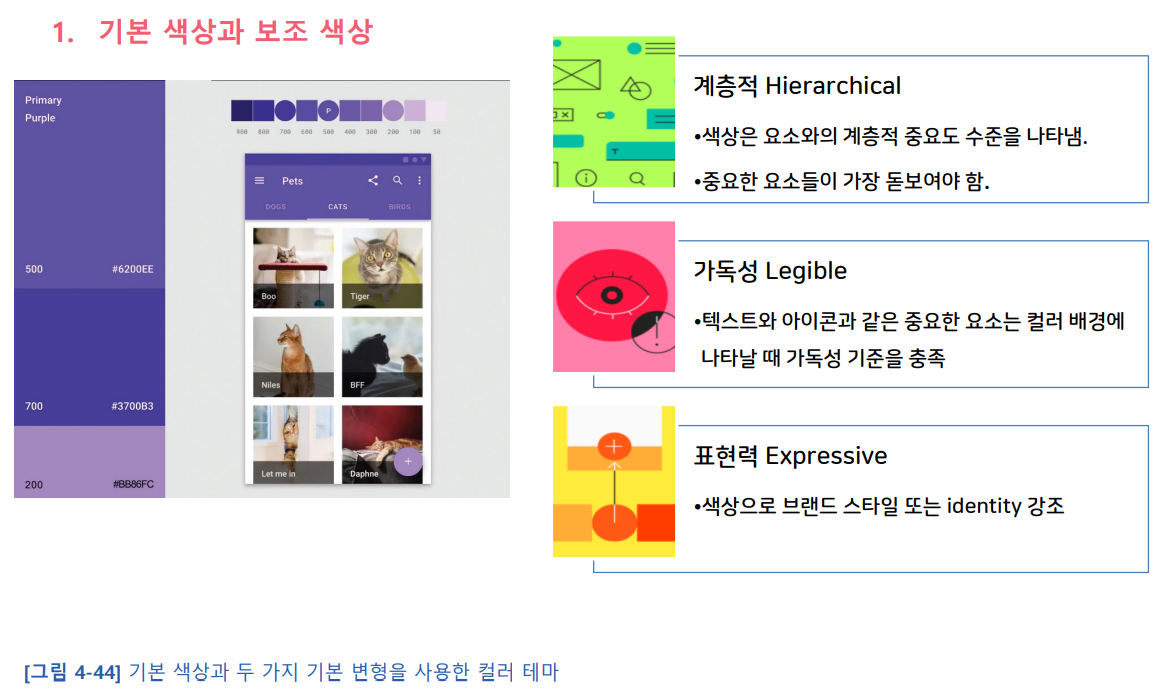 - 기본 색상은 앱의 화면과 구성 요소에 가장 자주 사용되는 색상으로, 보조 색상 없이 기본 색상만 으로도 구성 요소를 강조할 수 있다.