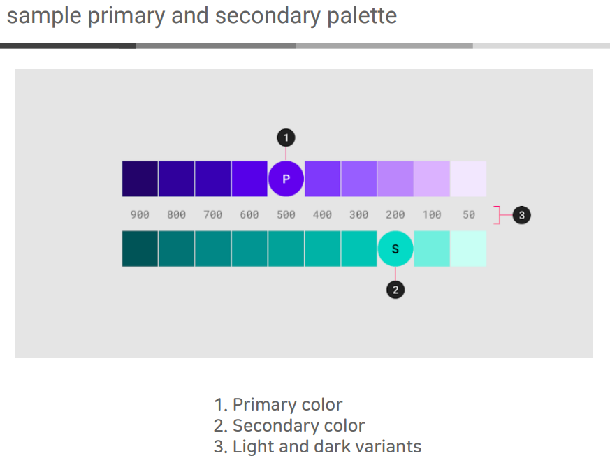 - 머티리얼 디자인에서는 기본 색상을 중심으로 밝고 어두운 단계를 만들어 사용한다. 기본 색상을 기준으로 100~900 단계로 나누어 각 단계별 색을 만들어서 UI에서 필요한 명도와 채도를 조절한다.