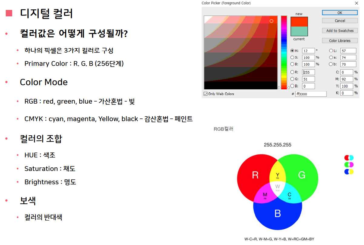 - 0부터 255까지의 RGB 값으로 R, G, B는 빛의 가산 혼합 방식으로 작동하는데 레드와 그린이 합쳐지면 옐로우가 만들어지며 레드와 블루가 합쳐지면 마젠타가 된다. 빛의 삼원색에서 서로 마주하는 색상은 보색이며 광원에서 원색을 빼면 보색이 남고 보색과 다시 원색을 합치면 광원이 되는 것이다.